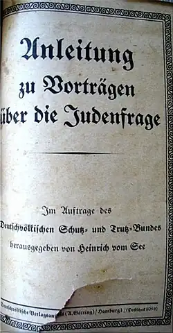 Die erste Phase in den letzten zwei Jahren vor der Auswanderung blieb sehr überschaubar. Unter seinem Ordensnamen Heinrich vom See verfasste er im Auftrag des DVSTB eine Anleitung zu Vorträgen über die Judenfrage.