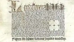 Im 13. und 14. Jahrhundert wurden deutlich mehr Urkunden abgefasst als zuvor, die Schriftlichkeit nahm stark zu.[112] Von Ludwig sind etwa 5000 Urkunden überliefert.[113] Die Bedeutung des Urkundenwesens wurde auch in den Formen der Textwahrung deutlich. Die von Heinrich VII. eingeführten Register auf Reichsebene wurden von Ludwig systematisch in großem Umfang fortgesetzt.[114]