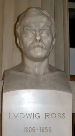 Ludwig Ross studierte an der Christian-Albrechts-Universität in Kiel Klassische Philologie. Nachdem er dort mit einer Arbeit über Aristophanes’ Komödie Die Wespen promoviert worden war, unternahm er seit 1832 ausgedehnte Studienreisen durch Griechenland, Westkleinasien und Zypern. Er gewann bald die Gunst König Ottos I. aus dem Haus Wittelsbach, der Griechenland von 1832 bis 1862 regierte. Ross wurde königlicher Beauftragter (Ephoros) für die Aufsicht über die antiken Denkmäler und 1837 erster Professor für Archäologie an der neu gegründeten Universität Athen. 1836 ernannte in die Preußische Akademie der Wissenschaften und 1837 die Bayerische Akademie der Wissenschaften zum korrespondierenden Mitglied.[2][3] 1843 musste König Otto I. auf Druck der Einheimischen viele Ausländer aus dem gehobenen Staatsdienst entlassen. Dies betraf auch Ross. Er kehrte nach Deutschland zurück und erhielt mit Hilfe seines Freundes Alexander von Humboldt 1845 den Ruf auf eine Professur für Klassische Archäologie an der Universität Halle.