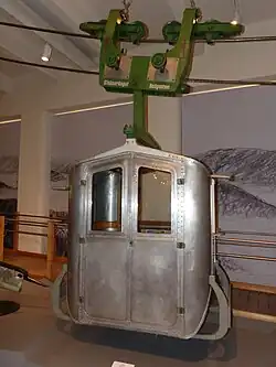 Die Fahrbetriebsmittel sind die üblicherweise selbst antriebslosen Fahrzeuge der Luftseilbahn. Diese können in vielfältiger Form beispielsweise als Kabinen, Gondeln, Sessel, Lastplattformen, Schüttgutloren oder bei Schwerlastseilbahnen als Lastgehänge mit eingebauten Hubwinden ausgeführt werden.[21] Sie sind je nach Bauart über ein Gehänge entweder mit dem Laufwerk verbunden, das vom Zugseil gezogen auf gummigefütterten Hohlkehlrollen auf den fest montierten Tragseilen fährt oder mit einem an- oder abkuppelbaren Klemmapparat oder einer festen (im Betriebsumlauf nicht lösbaren) Seilklemme mit dem umlaufenden Förderseil verbunden (siehe dazu auch Müller-Klemme und System Wallmannsberger).