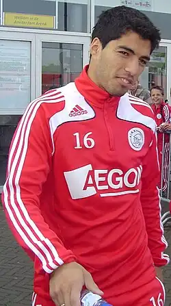 Nach nur einem Jahr in Groningen wechselte der Angreifer im August 2007 für eine Ablösesumme von 7,5 Millionen Euro zum Ligakonkurrenten Ajax Amsterdam.[11][16] Dort unterschrieb der Uruguayer einen Fünf-Jahres-Vertrag.[17] Sein Pflichtspieldebüt gab Suárez am 15. August 2007 in der Qualifikation zur UEFA Champions League gegen Slavia Prag.[18] Kurz darauf gab er im Spiel gegen VBV De Graafschap Doetinchem sein Ligadebüt und erzielte beim 8:1-Sieg seinen ersten Treffer für Ajax. Suárez schaffte es auf Anhieb, sich bei Ajax durchzusetzen, und hatte zudem das Amt des Mannschaftskapitäns inne. In der Saison 2009/10 erzielte er in 33 Spielen 35 Tore für den Amsterdamer Klub und wurde somit Torschützenkönig der niederländischen Liga. Insgesamt gelangen Suárez in dieser Spielzeit, in der Ajax den niederländischen Pokal gewann, wettbewerbsübergreifend 49 Treffer. Zudem wurde er 2010 auch als Fußballer des Jahres in den Niederlanden vor den Zweit- und Drittplatzierten Dries Mertens und Demy de Zeeuw ausgezeichnet.[19]