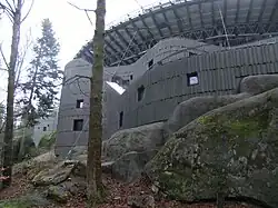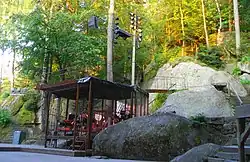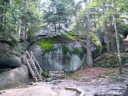 Unmittelbar an die Felsenbühne grenzt das Felsenlabyrinth. Eine Hanglage mit Felsen und Bewuchs bildet auch einen Teil der Kulisse.