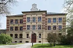 Das Schulgebäude wurde im Stil der späten Gründerzeit errichtet. Die symmetrische Gestaltung der Fassade des dreigeschossigen Baukörpers wird durch einen Mittelrisalit betont. Der Wechsel von roten Ziegelsteinen und gelb verputzten Flächen verleihen ihr eine lebendige Wirkung.