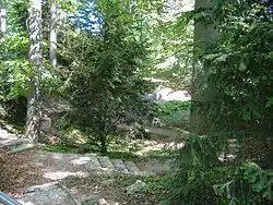 - der Sitz- und Denkmauer, die aus Steinen des alten Denkmals besteht;