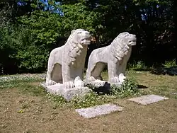- den zwei Löwen des Brigadedenkmals am ehemaligen Kavalier Spreti, das 1963 als einziges der sechs Kavaliere der einstigen Landesfestung abgerissen worden war;