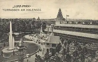 Am 14. Mai 1904 eröffnete der Gastronom August Aschinger zusammen mit dem ehemaligen Küchenchef des Kempinski, Bernd Hoffmann, die Terrassen am Halensee. Entworfen wurde das Gebäude von Kurt Berndt und A. F. M. Lange. Die Bauplastiken schufen die Bildhauer Carl Caspary und Robert Schirmer.[1] Es war ein moderner Märchenpalast mit beeindruckenden Türmen und einer großen Freitreppe zum Halensee hinunter. 1909 wurde die Anlage in Lunapark umbenannt, in Anlehnung an den 1903 eröffneten Lunapark auf Coney Island.[2]