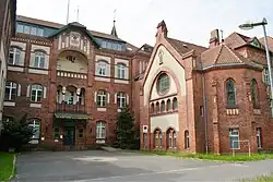 Die Nebengebäude des Klinikums sind schlichte Klinker-Putz-Bauten.[7]