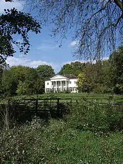 Die Schlossanlage besteht aus dem eigentlichen Schloss sowie einem weitläufigen Park, in dem der sogenannte Amortempel steht. Das Schloss ist ein im frühklassizistischen Stil erbautes zweigeschossiges Gebäude mit Walmdach und einem vorgelagerten Portikus, der auf vier ionischen Säulen gestützt ist. Der Portikus hat einen Dreiecksgiebel, in den die Inschrift „Carolus Otio“ gemeißelt ist. Vor dem Schloss befindet sich eine ovale Rasenfläche. Hinter dem Schloss befindet sich der Amortempel, ein an ein Monopteros erinnernder viereckiger Tempel, der aus zwölf ionischen Säulen, je drei pro Ecke besteht.