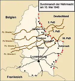 Der deutsche Angriff hatte das Ziel, die französischen Verteidigungsanlagen der Maginot-Linie durch ein Vorrücken durch den luxemburgisch-belgischen Raum zu umgehen. Dabei war Luxemburg als Durchgangsland von Interesse. Der Befehl zur Vorbereitung der Operation wurde bereits am 9. Oktober 1939 erteilt; der Angriffsbefehl wurde 29 Mal verschoben. Am 10. Mai 1940 begann der Angriff deutscher Verbände (Fall Gelb) mit insgesamt sieben Armeen auf die neutralen Staaten Niederlande, Belgien und Luxemburg (unbewaffnete Neutralität). Entscheidende Schlachten fanden einige Tage nach Luxemburgs Besetzung in den französischen Ardennen und Belgien statt; als erste die Schlacht bei Sedan (13.–15. Mai 1940).