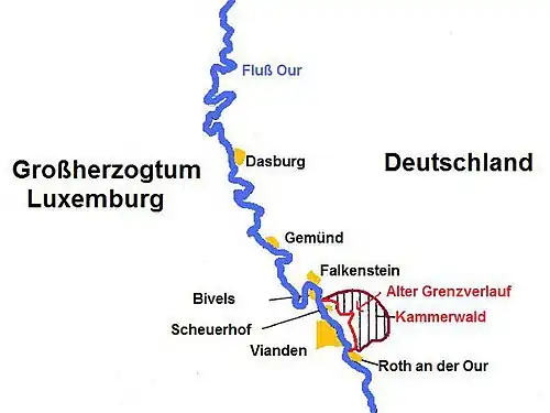 Kurz darauf verzichtete jedoch das Großherzogtum Luxemburg auf das Gebiet des Dorfes Roth und des Gutes Neuscheuerhof, so dass nur das unbewohnte Gebiet des Kammerwaldes von Deutschland abgetrennt wurde.