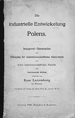 Julius Wolf wurde ihr Doktorvater. Er bezeichnete sie 1924 als „begabtesten“ seiner Studenten in Zürich.[16] Im Mai 1897 wurde Rosa Luxemburg in Zürich mit dem Prädikat magna cum laude zum Thema Polens industrielle Entwicklung promoviert. Mit empirischem Material aus Bibliotheken und Archiven von Berlin, Paris, Genf und Zürich suchte sie nachzuweisen, dass Russisch-Polen seit 1846 in den russischen Kapitalmarkt eingebunden und sein Wirtschaftswachstum vollständig von diesem abhängig sei. Damit wollte sie die Ansicht, die Wiederherstellung der nationalen Unabhängigkeit Polens sei illusorisch, mit ökonomischen Fakten untermauern, ohne explizit marxistisch zu argumentieren. Nach der Veröffentlichung wollte Rosa Luxemburg darauf aufbauend eine Wirtschaftsgeschichte Polens verfassen; das von ihr öfter erwähnte Manuskript dazu ging verloren, wurde aber nach ihrer Aussage in Erläuterungen von Franz Mehring zu von ihm herausgegebenen Marx-Texten teilweise verarbeitet.[27]