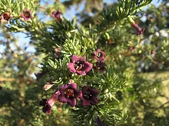 Der Kelch ist 5 bis 7 mm lang und tief fünfgezähnt. Die Krone ist 20 bis 22 mm lang und nahezu zylindrisch. Sie ist purpur-braun gefärbt und mit etwa 2 mm langen Kronlappen besetzt. Die Staubblätter stehen nicht über die Krone hinaus, die Staubfäden sind an der Basis mit einem dichten Büschel von Trichomen behaart.