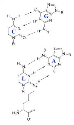 Cytidin-Guanosin-Basenpaar im Vergleich mit einem Lysidin-Adenosin-Basenpaar.
