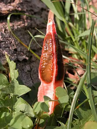 Die Sporenmasse (Gleba) bedeckt die senkrechten Einbuchtungen zwischen den Armen. Sie ist schleimig, hellbraun bis olivbraun, wird beim Trocknen dunkler und besitzt den typischen, unangenehmen Stinkmorchelgeruch.