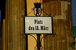 Bei der Volkskammerwahl von 1990, der ersten freien Wahl in der DDR, wurde am 18. März 1990 mit 48 % der Stimmen mehrheitlich die sogenannte Allianz für Deutschland gewählt. Damit hatten sich die Wähler für einen Beitritt der Deutschen Demokratischen Republik zur Bundesrepublik Deutschland ausgesprochen. Um die historische Tragweite dieser Entscheidung hervorzuheben, wurde die Wahl nachträglich als revolutionärer Akt bewertet und mit dem Berliner Barrikadenkampf vom 18. März 1848 in Verbindung gebracht. Eine solche Traditionslinie hatten die politischen Entscheidungsträger jedoch keineswegs beabsichtigt. Die Regierung Modrow wollte die DDR durch die Wahl „demokratisch-sozialistisch“ reformieren, um deren Unabhängigkeit zu bewahren. Eine nationale Einigung Deutschlands, wie sie schon die Berliner Märzrevolution eingefordert hatte, lag nicht in ihrem Interesse. Gleichwohl erstellte der Grafiker Manfred Butzmann ein 82,2 cm × 58,3 cm großes Plakat,[64] das einen Ausschnitt der berühmten Lithographie des Barrikadenkampfes am Alexanderplatz zeigt, die Anton Klaus 1848 geschaffen hatte. Im Kontrast zur Abbildung der Gewalt vom 18. März 1848 steht der Text des Plakates: „Die Revolution hat gewählt: Demokratie. Keine Gewalt“. Durch diese Darstellung wurde der 18. März „zum Inbegriff der gewaltfreien Revolution, die mit den Protestdemonstrationen im Herbst 1989 begann und mit den ersten demokratischen Wahlen ihren Abschluss fand“ (so Ulrike Ruttmann). Die gewollte Anknüpfung zwischen Märzrevolution von 1848 und friedlicher Revolution von 1989/1990 zeigt sich ebenso in einer im Jahr 2000 vollzogenen Platzumbenennung: Aus dem „Platz vor dem Brandenburger Tor“ wurde der Platz des 18. März.[65]