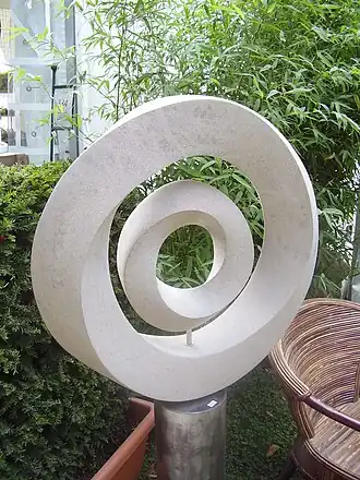 Berühmte Darstellungen des Möbiusbandes in der Kunst gibt es z. B. von M. C. Escher (Möbiusband I und II, 1963) sowie in neuerer Zeit von Gideon Möbius-Sherman. In der 1950 erschienenen Kurzgeschichte A Subway Named Mobius von A. J. Deutsch verschwindet ein Zug im komplexen U-Bahn-System von Boston.[5] Die Geschichte diente als Vorlage für die Filme Moebius (Deutschland 1992) und Moebius (Argentinien 1996). In der Literatur wird das Möbiusband ebenfalls thematisiert: Die Struktur von John Barths Kurzgeschichtenserie Lost in the Funhouse (dt. „Ambrose im Juxhaus“) basiert auf dem Unendlichkeits- oder Wiederholungsprinzip (z. B. fehlende Mitte) des Möbiusbandes. Auch wird dem Buch ein Möbiusband mitgeliefert, das postmoderne Literaturansätze („Frame-Tale“) spiegelt. Es ist beschriftet mit: „Once upon a time there was a story that began once upon a time …“. Diese Form der Selbstreferenz ist typisch für sogenannte Seltsame Schleifen. Der Lyriker Erich Fried bezieht sich in seinem Gedicht Topologik auf das Möbiusband: „Ich habe mir ein Möbiusherz gefasst, das sich in ausweglose Streifen schneidet.“ Max Bill schuf ab den 1930er Jahren zahlreiche Plastiken, die den visuellen Repräsentationen des Möbiusbandes entsprechen: z. B. Unendliche Schleife (1935/37), Kontinuität (Zürichsee; 1947, zerstört 1948) oder Unendliche Schleife (Stadtgarten Essen, an der Hohenzollernstraße; 1974).[6] Seine Skulptur Kontinuität (1986) stellt jedoch kein Möbiusband dar, entgegen gängiger Auffassung.