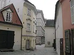 Hier befindet sich die Rückfront des Hauses Mölker Bastei 14, das 1845–1846 von Franz Schlirholz im frühhistoristischen Stil erbaut wurde.
