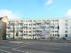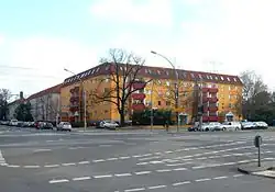 - 42: gelb verputzter Wohnblock an der Einmündung der Josef-Orlopp-Straße, der noch in der DDR-Zeit begonnen worden war