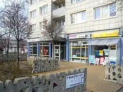 Der Einkaufskomplex gehört zum Ortsteil Fennpfuhl und wurde auf dem Areal der vormaligen Gärtnerei Bonack errichtet. - Bürotrakt,