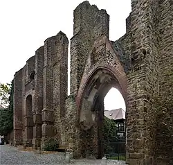 Das Franziskanerkloster brannte am 1. August 1401 vollständig ab, wurde aber wieder aufgebaut. Durch einen erneuten Brand im Jahr 1441 wurde das Kirchendach zerstört. Infolge der Reformation wurde das Kloster in der ersten Hälfte des 16. Jahrhunderts aufgehoben. Am 2. Juli 1598 brannten Kloster und Kirche vollständig nieder und wurden nicht wieder aufgebaut.[2]:303 Erhalten geblieben ist die frühgotische Mönchskirchenruine mit ihren Spitzbogenfenstern und dem Portal.