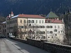 • Der Ansitz Freyenthurn: Die wuchtige Anlage prägt das Ortsbild. Die mittelalterliche Turmanlage, zwischen 1269 und 1277 von Friedrich von Rodank[8] erbaut, wurde 1578 von Georg von Enzenberg erworben. Er und seine Söhne bauten sie zum repräsentativen Adelssitz, umschlossen mit einer Mauer, aus. Der Ansitz wurde später weiter ausgebaut, so der Westflügel und im oberen Stock der Arkadengang. Als die Mühlbacher Linie der Enzenberg ausstarb, kam durch Erbschaft der Ansitz in die Hände der Herren von Vintler (Meran). Diese verkauften 1790 an den Pfleger und Landrichter Ignaz von Preu, und das Haus wurde zum Sitz des k. k. Landgerichtes von Mühlbach bis zu dessen Auflösung 1850. Der Mühlbacher Handelsmann Franz Xaver Gasteiger und der Brixner Kanonikus Franz Hirn stellten 1856 die Kaufsumme von 6000 Gulden zur Verfügung, womit die Tertiarschwestern von Brixen das Haus erwerben konnten als Niederlassung ihres Ordens, unter der Auflage, eine Schule für die Mädchen des Ortes zu errichten. Dies erfolgte 1860 mit der Errichtung der "Mädchen-Marktschule", siehe: Herz-Jesu-Institut (Mühlbach).