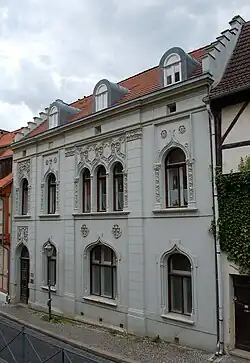 Das zweigeschossige Wohnhaus entstand in der Zeit um 1860 im Stil der Neogotik, wobei Formen der Spätgotik verwandt wurden. Anders als die umgebende, in Fachwerkbauweise errichtete Bebauung, entstand das Haus in massiver Ausführung. Die verputzte Fassade ist üppig verziert und durch Pilastern gegliedert. Fenster und Haustür sind von Kielbögen überspannt, die zum Teil mit Akanthuslaub verziert sind.
