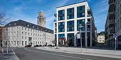Im Jahr 2003 startete in Mülheim an der Ruhr das strategische Stadtentwicklungsprojekt „Ruhrbania“ unter dem Motto „Stadt an den Fluss“. Ein zentraler Baustein dieser Strategie ist das Ruhrquartier[6] gleich neben dem Mülheimer Rathaus: Das Projekt besteht aus drei klar gegliederten Baukörpern mit Eigentums- und Mietwohnungen sowie Gewerbe- und Gastronomieflächen und verbindet die Mülheimer Innenstadt mit der Ruhrpromenade.