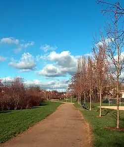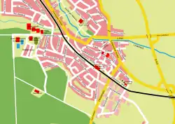Westlich, etwas abseits des Ortskerns, verläuft seit 1902 die Bahnlinie Höchst-Königstein der FKE, mit dem Bahnhof Kelkheim-Münster (vor der Eingemeindung nur „Bahnhof Münster“). Er wurde am 20. Februar 1902 eröffnet. Die Fläche zwischen Frankfurter Straße und Bahnlinie wurde größtenteils in der ersten Hälfte des 20. Jahrhunderts bebaut, nach der Eingemeindung Münsters 1938 begann man auch, anfangs vor allem entlang der Frankfurter Straße, die Fläche nach Kelkheim hin zu erschließen. Nach dem Zweiten Weltkrieg wurde zunehmend auch das Gebiet westlich der Bahntrasse genutzt, vornehmlich durch Wohnbauten der Hoechst AG (Farbwerksiedlung) entlang der Johann-Strauß-Straße.