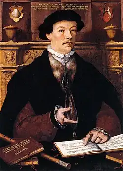 1547 malte Hermann tom Ring den Johannes Münstermann in Öl. Johannes Münstermann, ab 1544 Jurastudent in Köln und 1551 in einer Erbauseinandersetzung seiner Geschwister schon nicht mehr erwähnt, war ein Sohn vom oben bereits erwähnten Dietrich Münstermann Senior, 1524 Kämmerer und 1526–1533 sowie 1541 Münsteraner Bürgermeister. Dietrich Münstermann war in dritter Ehe mit Richmont Dreihus verheiratet, deren Familienwappen mit Lamm und Wolf auf Bild oben rechts dargestellt ist. Die Eheleute, die umfangreichen Besitz u. a. im Kirchspiel Velen, Bauerschaft Nordvelen hatten[4] und 1567 ihr Testament verfassten, hinterließen folgende Kinder:[5]