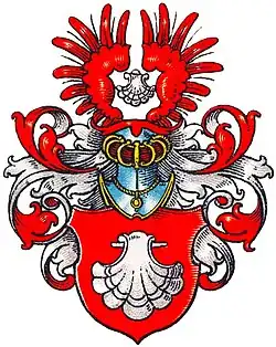 Blasonierung: In Rot eine silberne Muschel. Auf dem Helm mit rot-silbernen Helmdecken ein offener roter Flug, dazwischen die silberne Muschel.[1]