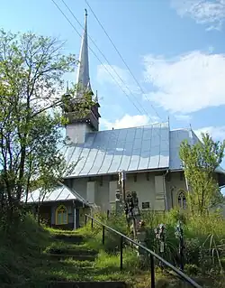 - Im Gemeindezentrum die reformierte Kirche,[6] wurde vor dem Mongolensturm von 1241 errichtet und gilt als die älteste reformierte Kirche im Klausenburger Gebiet. Im 15. Jahrhundert wurde auf der Westseite ein Narthex mit zwei Türmen angebaut. 1442 wurden die romanische Apsis durch gotische ersetzt. An der Südseite des Turms sind kleine Steinfiguren angebracht. Die Decke und Bänke der Kirche[7] wurden von der sächsischen Tischler- und Malerfamilie Umling aus Saschiz, um 1753 oder 1758 angefertigt.[3] Die Kirche steht unter Denkmalschutz.[4]