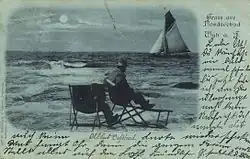 Um 1898 produzierte, 1901 gestempelte und mit der Nummer 377 fortlaufend nummerierte sogenannte Mondscheinkarte von Wyk auf Föhr nach einer Aufnahme des seit den 1890er Jahren auf Norderney ansässigen Fotografen Gottfried Sasse
