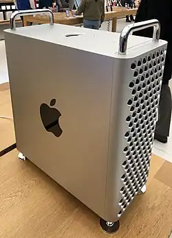 Die dritte Generation des Mac Pro wurde zusammen mit dem Apple Pro Display XDR auf der WWDC 2019 am 3. Juni vorgestellt. Das Gehäuse weist große Ähnlichkeiten zur 1. Generation auf, wodurch es wieder möglich ist, viele einzelne Komponenten auszutauschen und Steckplätze zu belegen, um die Möglichkeiten zu erweitern.[20] Auch er wird von der Fachwelt aufgrund seines Designs manchmal scherzhaft als Käsereibe bezeichnet.[21][22]