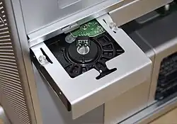 - Optische Laufwerke: Für die Verwendung optischer Datenträger ist im Mac Pro standardmäßig ein 18x SuperDrive-Laufwerk verbaut. Dieses liest alle gängigen CD- und DVD-Formate und beschreibt DVD±R, DVD+R DL, DVD±RW, CD-R und CD-RW. Ein zweiter Steckplatz für optische Laufwerke ist vorhanden. Blu-ray-fähige Laufwerke werden von Apple bislang nicht angeboten.