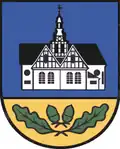 Blasonierung: „Auf blauem Grund mit goldenen Schildfuß ein silbernes langgestrecktes Gebäude mit zwei Fachwerkgiebeln und schwarzem Dach, in der Mitte ein silberner Turm mit geschwungener Haube, der Schildfuß ist belegt mit zwei an den Stielen gekreuzten grünen Eichenblättern, darüber schwebend zwei grüne Eicheln.“