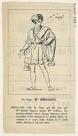 Über die familiäre Herkunft Menjauds ist lediglich bekannt, dass ihr Vater Justiziar war. Sie debütierte, noch sehr jung, am Théâtre l'Impératrice, von wo aus sie im Jahr 1810 an das Pariser Konservatorium ging und dort unter Abraham-Joseph Bénard studierte. Dort schloss sie als Drittbeste, im Fach der Komödie ab. Ihre ersten erfolgreichen Engagements führten sie nach Rouen und Nantes, wo sie Mademoiselle Mars kennenlernte, die sie im Jahr 1815 in die Comédie-Française einführte. Obwohl der Theaterdirektor von Nantes versuchte, sie wenigstens bis zum Ende der Spielzeit zu halten, debütierte Menjaud in Desforges Komödie La Femme Jalouse in der Rolle der Charlotte. Da sie jedoch mit 19 Jahren noch nicht volljährig war, durfte sie keine Hauptrollen spielen, was beinahe zu einem Prozess geführt hätte, und nur eine Sondererlaubnis, in der die Rollen begrenzt waren, konnte ihre Jahresengagements aufrechterhalten. Sie war dann mit diesen Rollen auch unzufrieden und beantragte, gerade volljährig geworden, im Jahr 1819, die Aufnahme in die Société de la Comédie-Française. Ihre Gage wurde dann zwar erhöht, sie bekam bessere Rollen, aber die Aufnahme in die Société wurde ihr noch verweigert. Es wird gemutmaßt, dass ihre auffällige Nase der Grund dafür war, dass der Beitritt zur Société erst 1828 erfolgte. Im Jahr 1836 nahm sie ihren Bühnenabschied und die Abschiedsvorstellung fand 1841 statt.