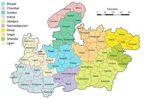 Der Bundesstaat Madhya Pradesh ist in die zehn Divisionen Bhopal, Chambal, Gwalior, Indore, Jabalpur, Narmadapuram, Rewa, Sagar, Shahdol und Ujjain sowie in folgende 52 Distrikte untergliedert (Einwohnerzahl und Bevölkerungsdichte nach der Volkszählung 2011):[10]