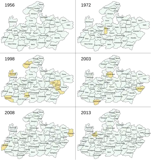 Bei der gesamtindischen Parlamentswahl 2014 gewann die landesweit siegreiche BJP in Madhya Pradesh 27 von 29 Wahlkreisen in dem Bundesstaat. Die verbliebenen beiden Wahlkreise gingen an die Kongresspartei. Bei der darauffolgenden Parlamentswahl 2019 lag das Verhältnis bei 28 zu 1 Wahlkreisen.