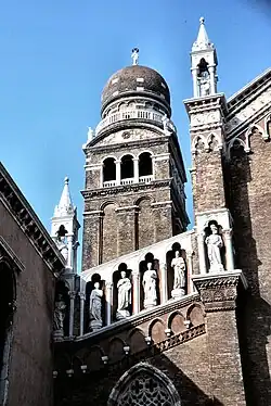 Die Hauptfront orientiert sich an den Monumentalbauten der Frarikirche und Santi Giovanni e Paolo (Zanipolo), die sie in bescheideneren Maßen rezipiert. Die dreigeteilte Fassade entspricht der Aufteilung des Innenraumes und ist ebenfalls ein Ziegelbau. Die reichen Maßwerkfenster zum Campo sind um 1440 zu datieren. Das Portal von Bartolomeo Bon ist, wie jenes von Santi Giovanni e Paolo, ein Hauptwerk der spätgotischen Bildhauerkunst. Der Korbbogen wird von einer Statue des Hl. Christophorus, dem Schutzpatron der Händler, bekrönt. Die beiden flankierenden Säulen, die jeweils eine Maria tragen, wurden erst 1481 hinzugefügt. Die Fassade weist des Weiteren reichen figuralen Schmuck auf (Figuren der Tugenden und der zwölf Apostel).