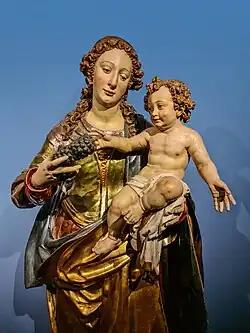 Die aus Holz geschnitzte, farbig gefasste Standfigur hat mit einer Höhe von etwa 170–175 cm Lebensgröße. Der Jesusknabe sitzt auf dem linken Arm der Mutter und greift mit der rechten Hand nach einer blauen Weintraube, die sie ihm reicht. Die Weinbeeren, aus denen der Saft quillt, gelten als Symbol des Blutes Christi am Kreuz und in der Eucharistie. Beim Bildtyp der Traubenmadonna hat die scheinbar idyllische Handlung zwischen Mutter und Kind diesen ernsten Hintergrund.