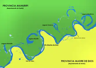 Unterhalb von Boca de Manú schwenkt der Río Madre de Dios aus seiner zunächst andenparallelen, südöstlichen Fließrichtung allmählich nach Nordosten ein, der Hauptrichtung der Flüsse im südlichen Amazonasbecken. Bei Puerto Tahuantínsuyo mündet der erste von zahlreichen rechten Nebenflüssen, der Río Azul. Wenig später mündet der Río Colorado, in dessen Oberlauf große Areale als Folge großenteils illegaler Goldgewinnung nahezu verwüstet sind, und dessen Wasser eine hohe Quecksilberbelastung aufweist.[7] Der größte Nebenfluss ist der aus den andinen Randketten stammende Río Inambari und der längste der danach von links mündende Río Las Piedras. Gegenüber liegt im Mündungswinkel des Río Tambopata die einzige bedeutende Stadt am Río Madre de Dios, Puerto Maldonado, Hauptstadt der Region Madre de Dios und Handelszentrum mit kleinem Flughafen. Die Stadt trägt offiziell den Titel: Capital de la Biodiversidad del Perú (Biodiversitätshauptstadt Perus). Ab hier wird der Fluss auch Bajo Madre de Dios (Unterer M.) genannt.