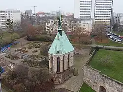 Die gotische Kapelle ist aus Bruchsteinen gemauert. An den Gebäudekanten wurden Sandsteinquader verwandt. Die Kirche besteht aus einem quadratischen Joch mit einem 5/8-Polygon. Das Gebäude verfügt über keine Strebepfeiler, getragen wird der Bau von dicken Außenmauern und einem Tonnengewölbe in der Unterkirche. Links neben dem westlich gelegenen Eingang befindet sich ein kleiner Treppenturm. Es wird vermutet, dass dieser ursprünglich den Zugang vom Klostergarten des benachbarten Klosters Mariae Magdalenae zur Kapelle ermöglichte.