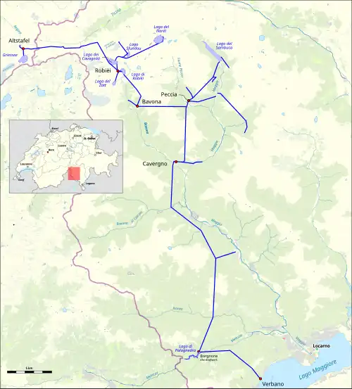 | Gewässer | Lago di Robièi, Lago del Narèt, Lago del Sambuco, Lago dei Cavagnöö, Griessee, Lago Sfundau, Lago di Palagnedra, Lago del Zött, Maggia, Bavona, Rovana, Isorno, Melezza | ||