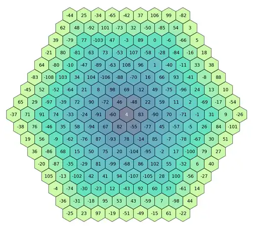 In der Abbildung markieren dunklere Helligkeitswerte Waben mit höherem Einfluss auf andere Waben. So hat die zentrale Wabe in der Mitte des Hexagons (Wert 4) den größten Einfluss, nämlich auf 48 andere Waben (= 3 * 16, wobei 16 die Länge der drei Hauptdiagonalen ohne das Zentralfeld selbst (17-1) ist, die durch das Zentralfeld laufen). Je weiter außen sich eine Wabe befindet, desto weniger andere Waben sind von ihr abhängig, wie man durch einfaches Nachzählen leicht finden kann. Abhängig heißt, dass eine Veränderung des Wertes einer Wabe bedingt, dass die Zahlenwerte in den anderen (abhängigen) Waben ebenfalls angepasst werden müssen, damit die magische Konstante M für alle Diagonalen und Reihen identisch ist.