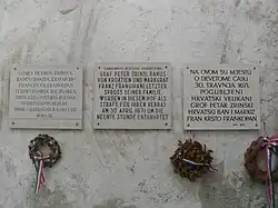 Gedenktafeln in Lateinisch, Deutsch und Kroatisch an der Hinrichtungsstätte von Frankopan und Zrinski, dem ehemaligen Zeughaus (Stadtpark Wiener Neustadt, 2010)
