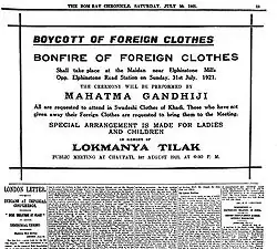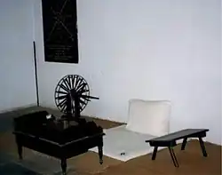 Er bediente selbst ein altes Spinnrad, lehnte den Gebrauch der englischen Sprache mehr und mehr ab und ließ Schüler in seinem Sinne unterweisen.[68] Das Spinnen wurde zum Symbol der indischen Unabhängigkeit. Gandhi erwartete, dass sich möglichst viele Menschen daran beteiligten. Er bediente das Spinnrad selbst in politischen Versammlungen.[69] Um seine Spinnradkampagne zu finanzieren, unternahm er Bahnreisen in der dritten Klasse durch Indien und sammelte Spenden, die ihm großzügig zuteilwurden. Damit erwarb er Spinnräder für die Bauern, ließ Lehrer für Spinnen und Weben ausbilden und gab Geld für Geschäfte, die Textilien aus den Dörfern verkauften. Das Spinnrad ist noch heute Teil der indischen Flagge.[70]