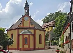 - Die 1687/89 erneuerte Katharinenkapelle mit ihrem achteckigen Grundriss, heute evangelische Pfarrkirche, mit einer weitgehend aus dem 18. Jahrhundert stammenden Ausstattung