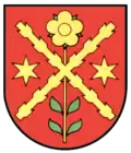 - Die Blasonierung des Wappens von Orschweier lautet: „In Rot eine goldgestielte, grünbespitze, goldene Rose mit vier grünen Blättern, überdeckt von einem goldenen Astschrägkreuz, beseitet von je einem sechsstrahligen goldenen Stern.“