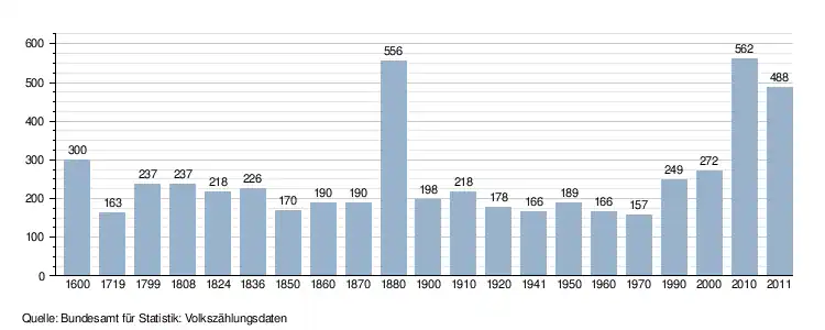 - ↑ Daten der Eidgenössischen Volkszählungen ab 1850 nach Gemeinden. (XLSX; 10 MB) Bundesamt für Statistik, Neuchâtel, 12. Juli 2024, abgerufen am 31. Januar 2025 (Öffnung in Excel nur über "Anhang/Excel-Datensatz" möglich).