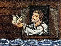 Tiere gehen zu zweit in Noahs Arche; Noah lässt nach der Sintflut Taube aus NO